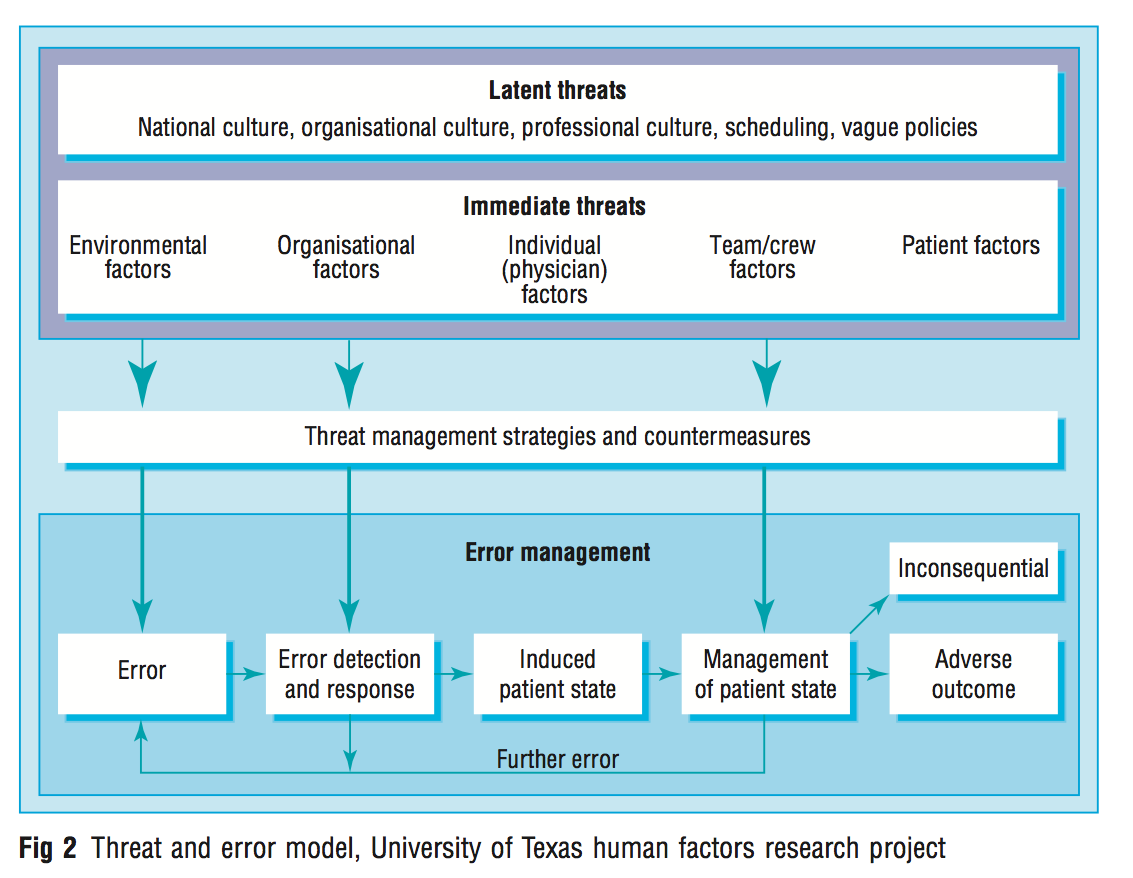 The University of Texas Threat and Error Management Model (UT-TEMM) model was developed by human factors researchers at the University of Texas as a conceptual framework to understand the interactions between safety and human performance in aviation. The model is based on aeronautical incidents and accident analysis in high-capacity airlines. It’s based on direct observation studies on the flight deck, and is based on the fundamental premise that threats and errors are inevitable components of complex systems, which is why TEM advocates management as opposed to avoidance. There are 3 components of TEM: threats, errors, and undesired states. Within a healthcare context, threats are events or errors that occur outside the influence of the operating team, increasing the operational complexity of the procedure and promoting opportunity for human error. Threats are elements of the system that provide the circumstances in which human error can occur. Types of threat include patient threats, task threats, environmental threats (equipment and resources), culture, and organizational threats.